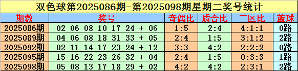 双色球在第2025086期-第2025098期周二开奖中,红球奇偶比累计为12:18,偶数号码走势比拟热;红球质合比累计为12:18,质数号码开出较多;红球三区比累计为11:10:9,三区号码出现个数基本相称。