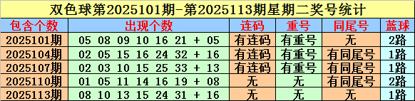 双色球在第2025101期-第2025113期周二开奖中,连码组合出现了3期,开出比例相对较低;有3期开奖包含了重号,重号出现比例较低;同尾号码出现了3次,走势相对较冷。 蓝球周二主要为0路和2路奖号,出现概率为60%。 最近十周星期二已开出的红球有:01 02 03 04 05 06 08 09 10 11 13 14 15 16 17 18 19 21 22 23 24 25 26 29 31 32 33,共27个。 最近十周星期二莫得出现的红球有:07 12 20 27 28 30,共6个。 本周星期二红球缩水条目参考: 奇偶比2:4 质合比1:5 三区比2:1:3 有连码 看好出现上周二红球重号 温存红球同尾号码