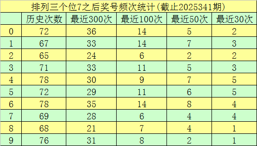 第三位杀号:第三位上期出现奖号7,该位历史上奖号7已开出了717次,最近100纪律三位开出7时,下期号码0-9离别落号:号码1、0、6→14次,3、5→11次,4→9次,9→8次,8→7次,2、7→6次。